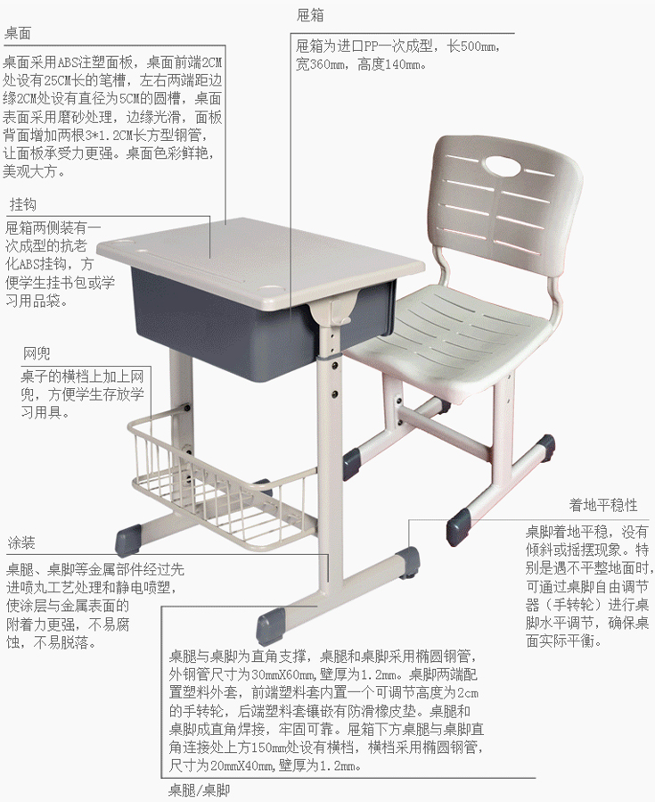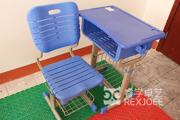 桌面采用ABS注塑面板,桌面前段2cm處設有25cm長的筆槽,左右兩端距邊緣2cm處設有直徑5cm的圓槽,桌面表面采用磨砂處理,邊緣光滑,面板背面增加兩根3*1.2cm長方形鋼管,讓面板承受力更強。桌面色彩鮮艷,美觀大方。